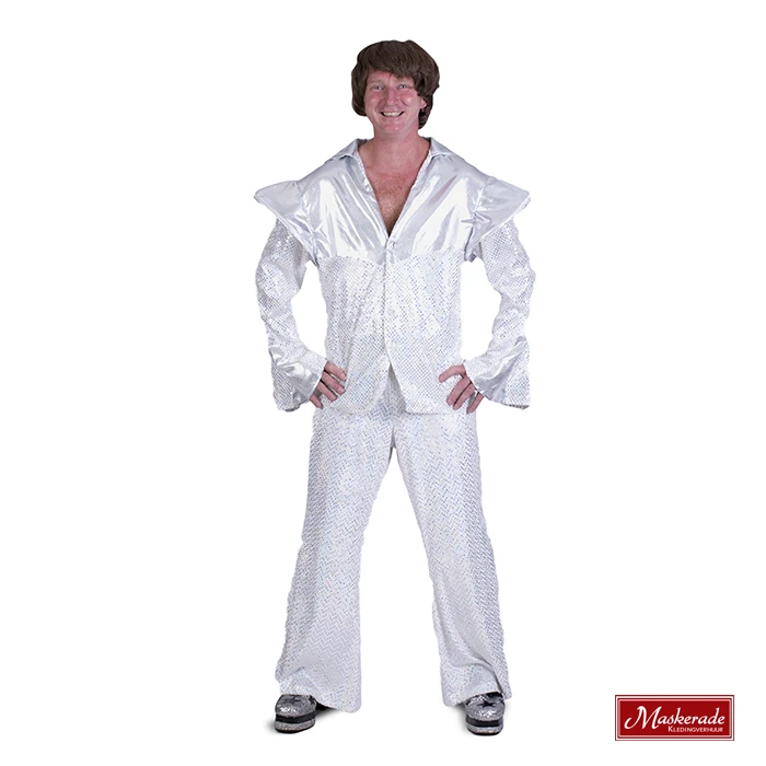 Het ABBA kostuum voor Björn bestaat uit een witte glitterende catsuit met een bruine korte pruik.