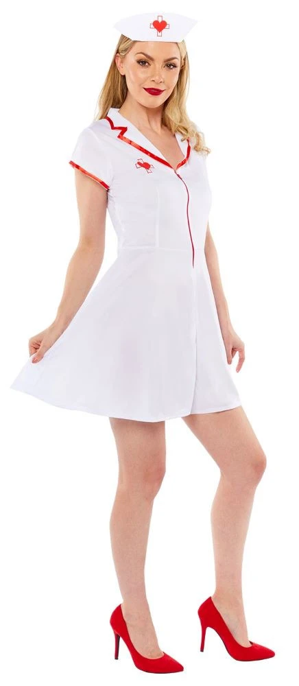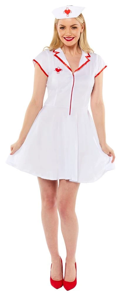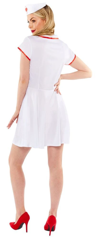 Wanneer je op het feest verschijnt in dit sexy Verpleegster Stacy kostuum, zal het werk niet lang op zich laten wachten. De verleidelijke look van deze korte, nauwsluitende jurk zal bij velen het hart sneller doen slaan. De bijpassende muts is inbegrepen. Om je zinnelijke look compleet te maken, raden wij aan deze jurk te combineren met een visnet panty of kousen.