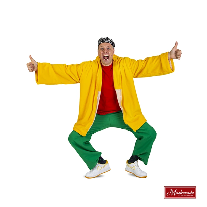 Dit kostuum van Bobbie van Ernst, Bobbie en de rest bestaat uit: een geel vest, rood shirt, groene broek en zwarte pet.