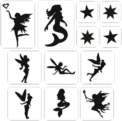 Met deze fantasie glittertattoo sjablonen maakt u heel eenvoudig een leuke glittertatoeage van verschillende elfjes.