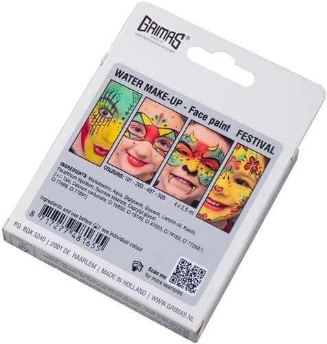 Deze vrolijke Grimas Schminkset Festival bestaat uit 4 kleuren Water Make-up (2,5 ml).