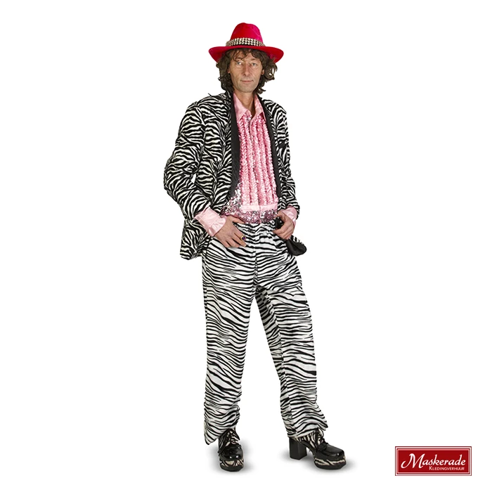 Dit kostuum met zebra print bestaat uit een jas en broek met daaronder een lichtroze blouse met rouches. De blouse kan er in elke gewenste kleur bij.