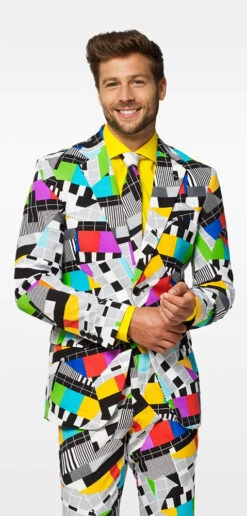 Degenen die vóór de 2000 zijn geboren, herinneren zich misschien nog wel – televisie werkte soms niet. Ondenkbaar in het huidige tijdperk van digitale technologie. Reis in de tijd met ons Opposuits Party Suit Testival . Het elegant gesneden driedelige model overtuigt met zijn retro-testpatroon en wordt geleverd met bijpassende stropdas rechtstreeks bij u thuis. Het casual vintage pak garandeert je veel aandacht, of je nu op de bank zit of op het volgende feest.