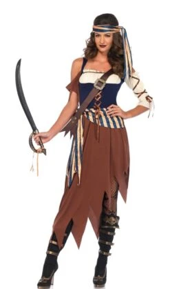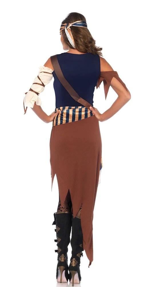 Het Piratenbruid Dames Kostuum Cäcilia is een gedurfd, uitgewerkt kostuum bestaande uit een jurk met een gedetailleerde blouse corsage look met vetersluiting en een schuine rok. Het kostuum is compleet met een buikband, bijpassende hoofddoek, gordelsluiting en een blouseachtige buikband met mooie linten. Een perfecte stijl voor grote verkleedpartijen!