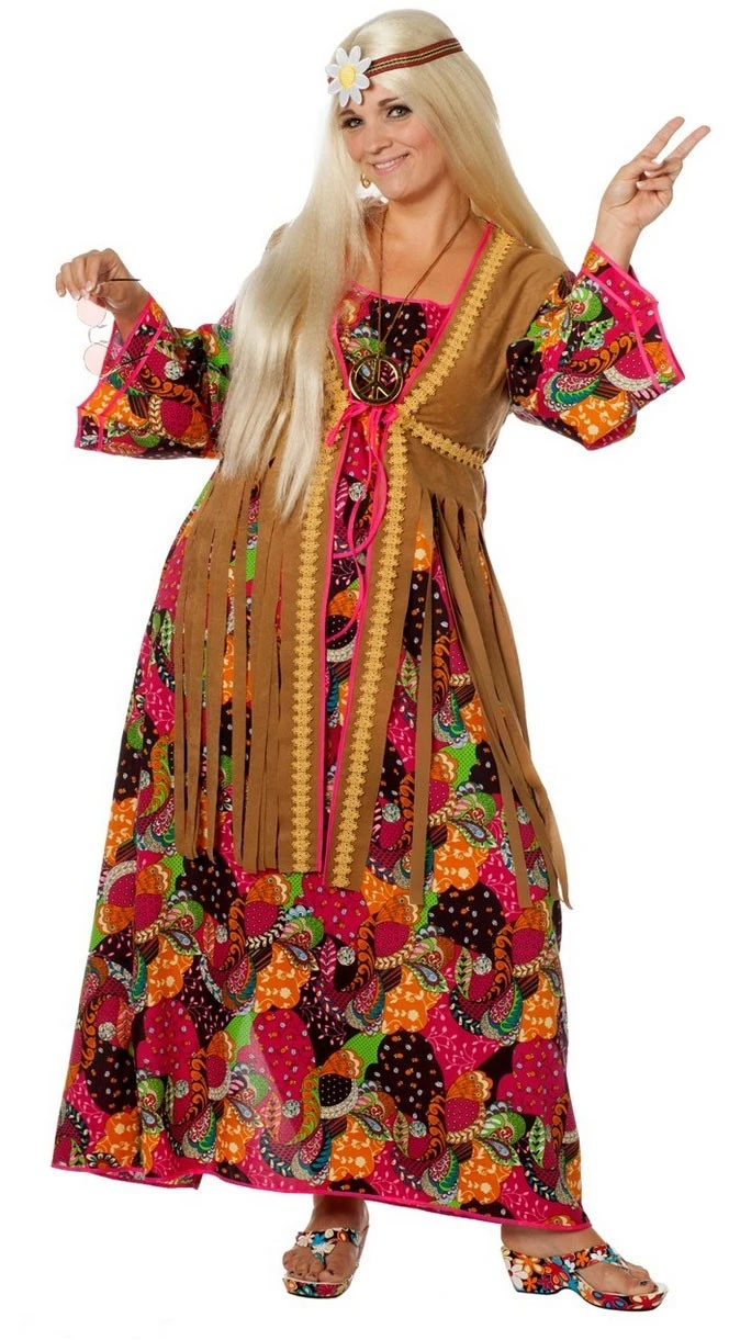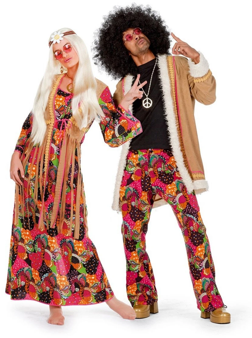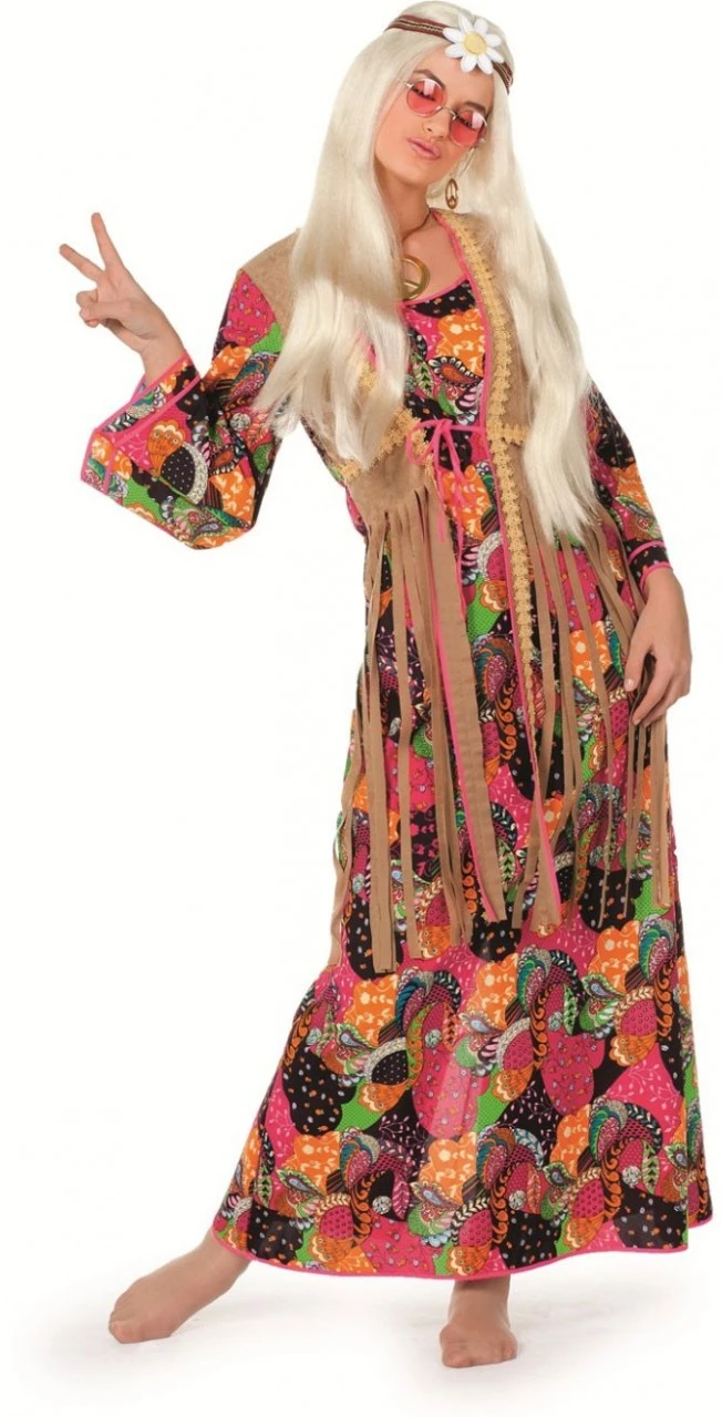 Welkom in de jaren 70! Met de retro hippie-jurk verander je in een mum van tijd in de flower power-koningin van het feest! Het kleurrijke bloemmotief en het bruine omzoomde vest maken je tot een blikvanger op het themafeest uit de jaren 70 of op de Schlagermove . Maak je look compleet met een bijpassende ketting en pruik (geen van beide inbegrepen).
