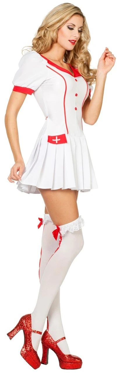 Als u niet onmiddellijk medische hulp inroept wanneer u het sexy verpleegsterskostuum ziet, moet u echt worden behandeld. Het bestaat uit een kort gesneden jurk met geplooide rok en de typische rode en witte kruisapplicaties.