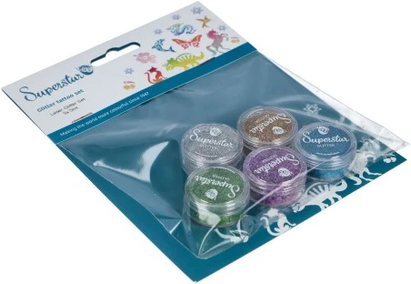 Deze Laser Glittertattoo Glitter Set van Superstar bestaat uit 5 kleuren glitters in potjes met een inhoud van 5 ml. De kleuren in deze glitter tattoo glitter set zijn: 401-402-403-404-408.