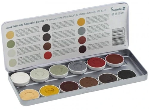 Superstar Schminkpallete Fearsome Faces by Matteo Arfanotti bevat 12 kleuren een zeer gebruiksvriendelijke waterschmink van hoge kwaliteit en voldoet aan alle strenge eisen van de Europese Cosmetica Wetgeving (1223/2009/EG).