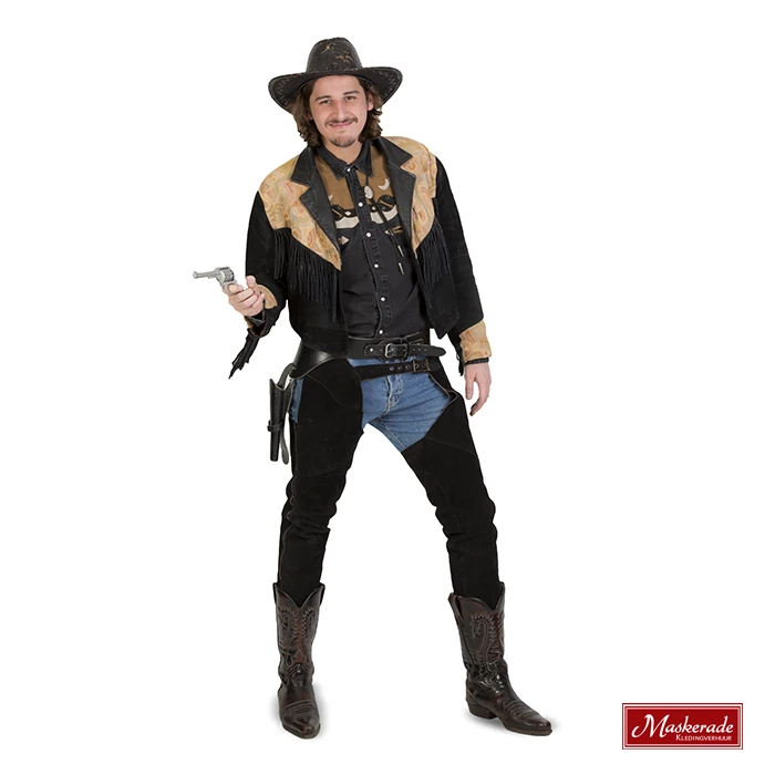 Dit cowboy kostuum bestaat uit een zwarte cowboyjas van van suede met lichtbruine print, daaronder een zwarte blouse met aan de bovenkant ook een bruine print en eronder zwarte suede chaps. Inclusief zijn de cowboylaarzen en de hoed.